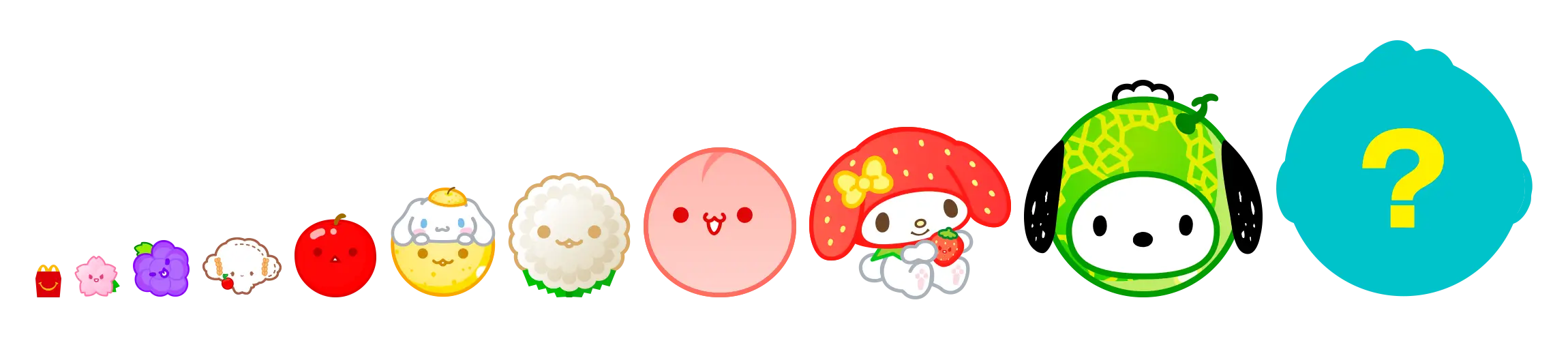 スイカゲームでおなじみの“シンカ”が、ハッピーセット「サンリオキャラクターズ」とのコラボレーションでさらに華やかに。フルーツをぶつけ合って大きくしていく過程では、おなじみのサンリオキャラクターズが次々と登場します。どの段階でどのキャラクターに会えるのか、一瞬たりとも目が離せません。そして”シンカ”の最終形である「スイカ」に該当するキャラクターは、第1弾と第2弾でそれぞれ異なるデザインで登場します。第1弾では「ハローキティ」がスイカに。そして第2弾では、“ひみつのおもちゃ”にも関係するあのキャラクターが登場するかも……?その正体は、ぜひ実際にプレイして、あなたの目で確かめてみてください。